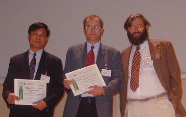 Wei Zong and Günther Schreier receive congratulations from challenge organizer George Moody at CinC 2001.