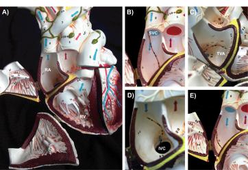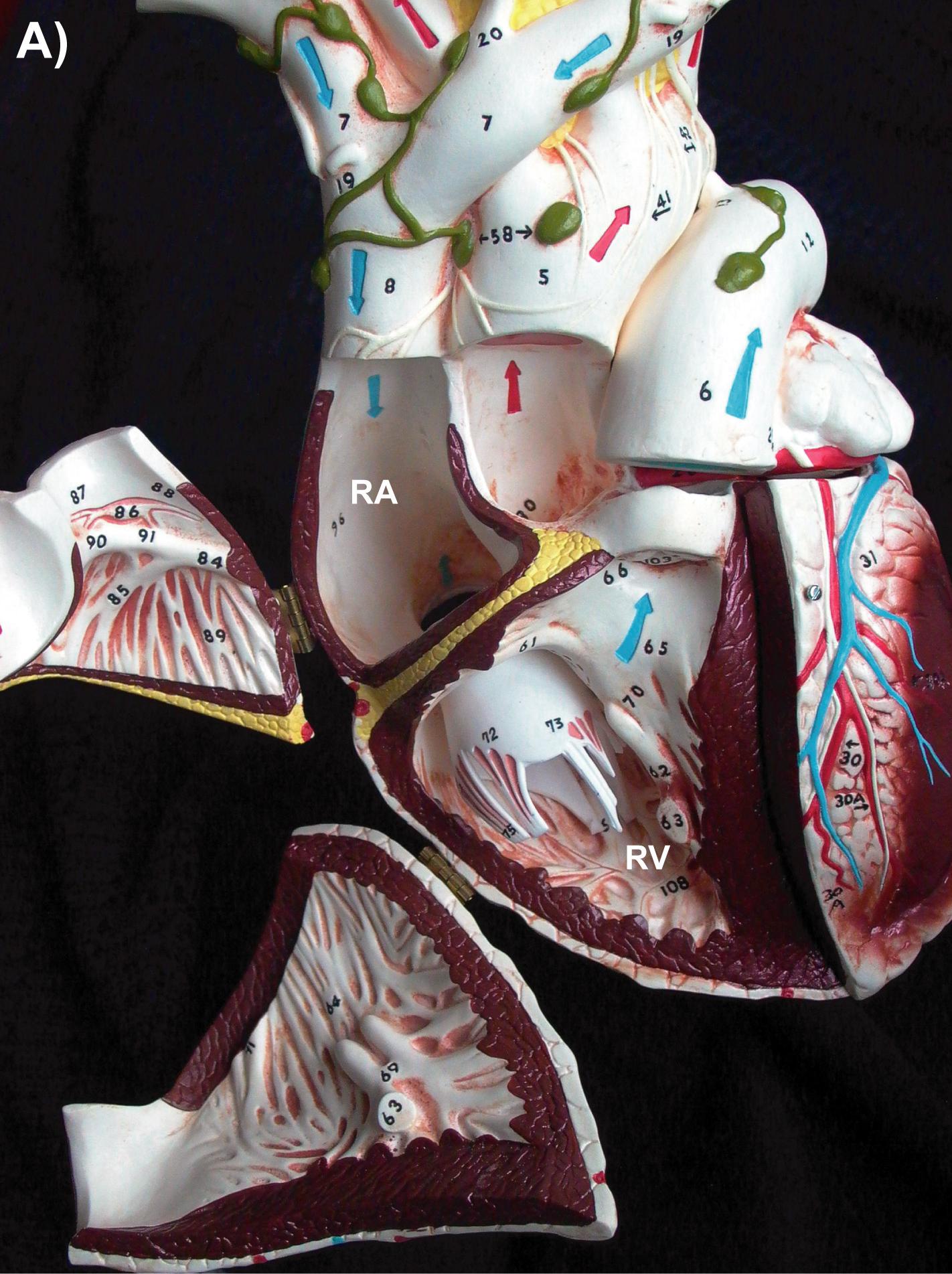 - Anterior view of a heart model, with the interior of the right atrium (RA) and right ventricle (RV) exposed.