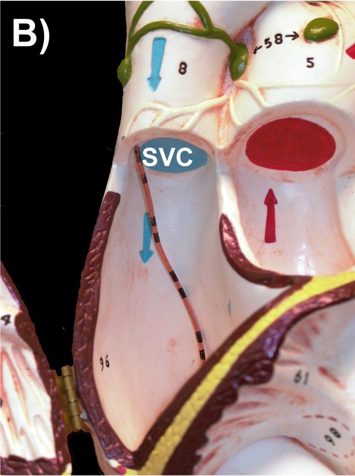 - Catheter placement for SVC, where the distal tip is just inferior to the annulus of the superior vena cava, and the catheter is against the posterior wall of the atrium. Eight poles (black marks) of the decapolar catheter model (copper wire) are visible.