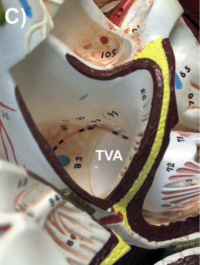 - Placement for TVA, where the distal tip is on the tricuspid valve annulus and the electrodes are against the septal wall.