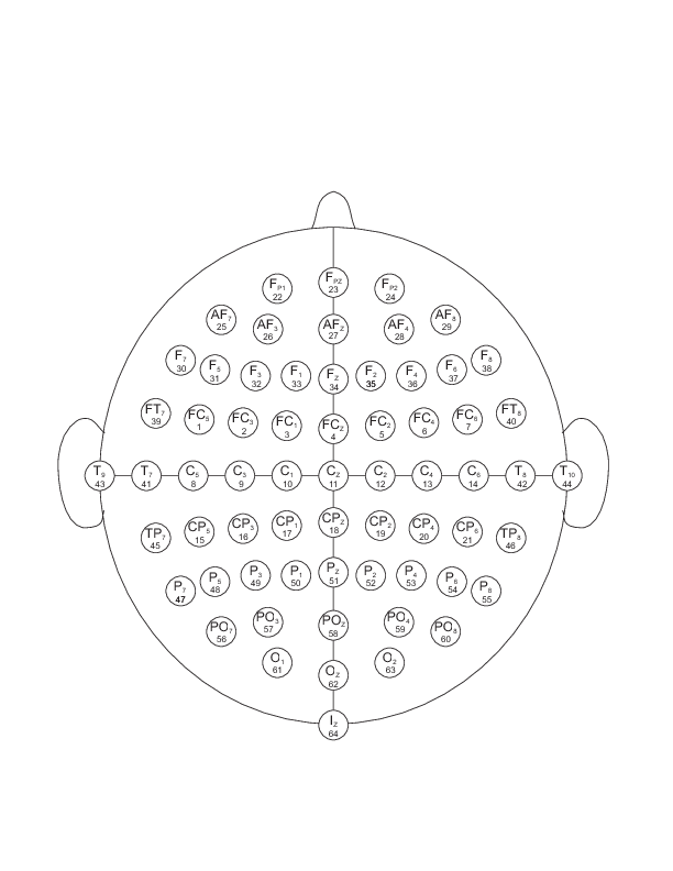 The EEGs were recorded from 64 electrodes as per the international 10-10 system (excluding electrodes Nz, F9, F10, FT9, FT10, A1, A2, TP9, TP10, P9, and P10), as shown below (and in this PDF figure). The numbers below each electrode name indicate the order in which they appear in the records; note that signals in the records are numbered from 0 to 63, while the numbers in the figure range from 1 to 64.